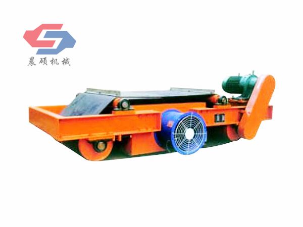 電磁除鐵器的基礎上增加了驅動電機、滾筒、帶刮板的缷鐵膠帶等組成的缷鐵機構。在工作過程